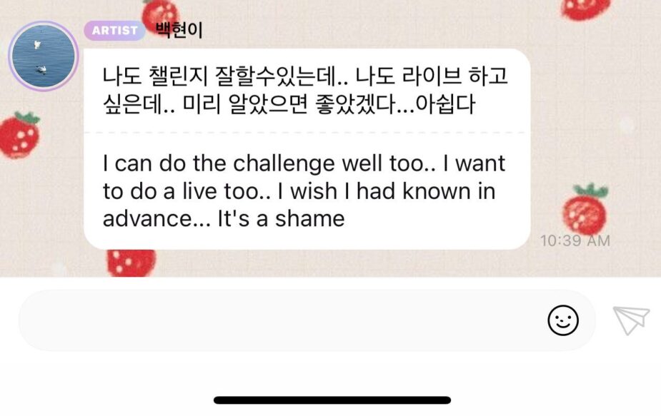 Bakehyun: I’m good at challenges too… I want to do a live as well… Wish I had known in advance… Such a shame.