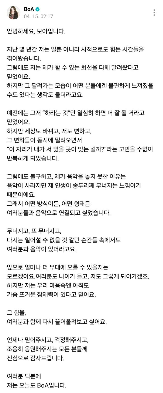 “Hello, this is BoA. For the past few years, I have been going through some difficult times at work and privately. Even so, I felt I had come this far and done my best. But I also felt that the sight of me running this far might have felt uncomfortable to some. Before, I believed that if I just worked hard on what I was told, things would get better.