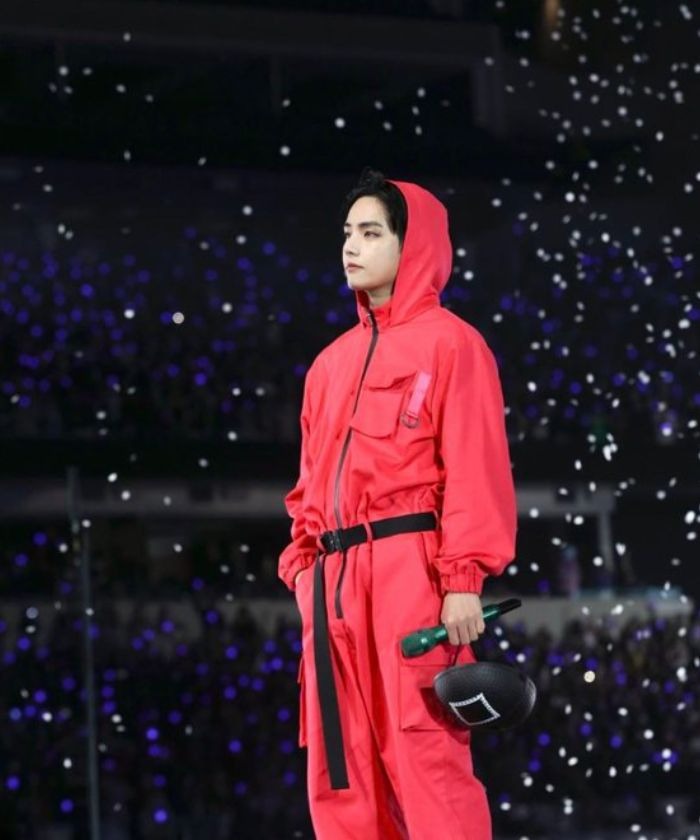 In 2021, V took the internet by storm after he appeared in the Squid Game guard costume on stage at the SoFi Stadium in Los Angeles during BTS’s Permission to Dance on Stage – Live Play concert. Clips of him revealing his face from underneath the mask and posing went viral on social media, creating some next-level frenzy even among non-fans. Even Netflix jumped onto the hype!