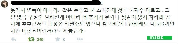 “I’m not just raging for not being able to go.. I paid the same amount of money but the first and second week are different.. And it wasn’t just a change of the order of songs, but an addition of more songs. Or at least let us know by an announcement that there might be a change in the contents of the concert..”