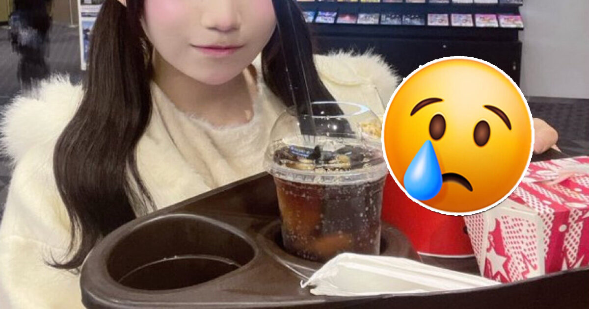 In the photo, Azu holds a tray of snacks and a drink at a movie theater.