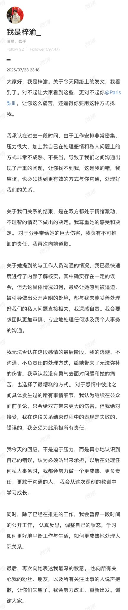 In addition, once my current work obligations are fulfilled, I will suspend public activities for a while to reflect, stabilize myself, and learn how to better balance my work and life — as well as how to manage relationships more maturely.