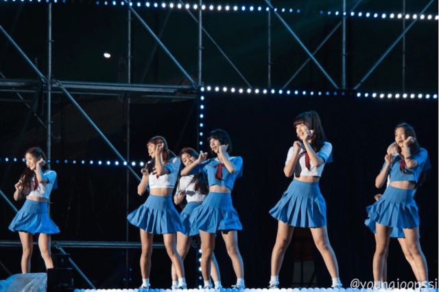 Photos of the female group’s stages show the members in very short high-waisted school skirts that just reach the top of their thighs, or are performing in a uniform with a cropped top.