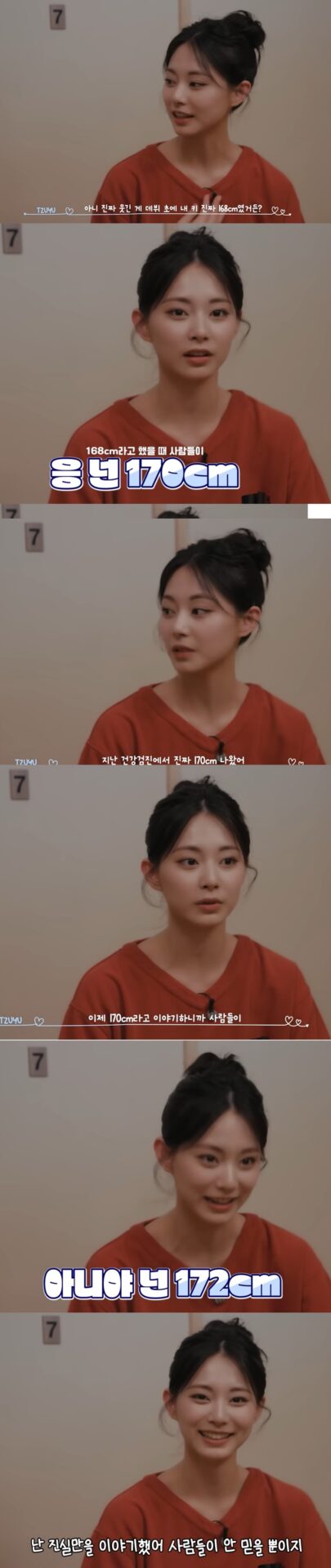 “What’s funny is that my height was really 168cm during debut. But When I said I was 168 cm tall, people would tell me, ‘Nope, you’re 170cm.’ And during the last health checkup, my height really came out to be 170cm. But now that I say I’m 170cm, people go, ‘No, you’re 172 cm.’ I am telling the truth, but people won’t believe me.”