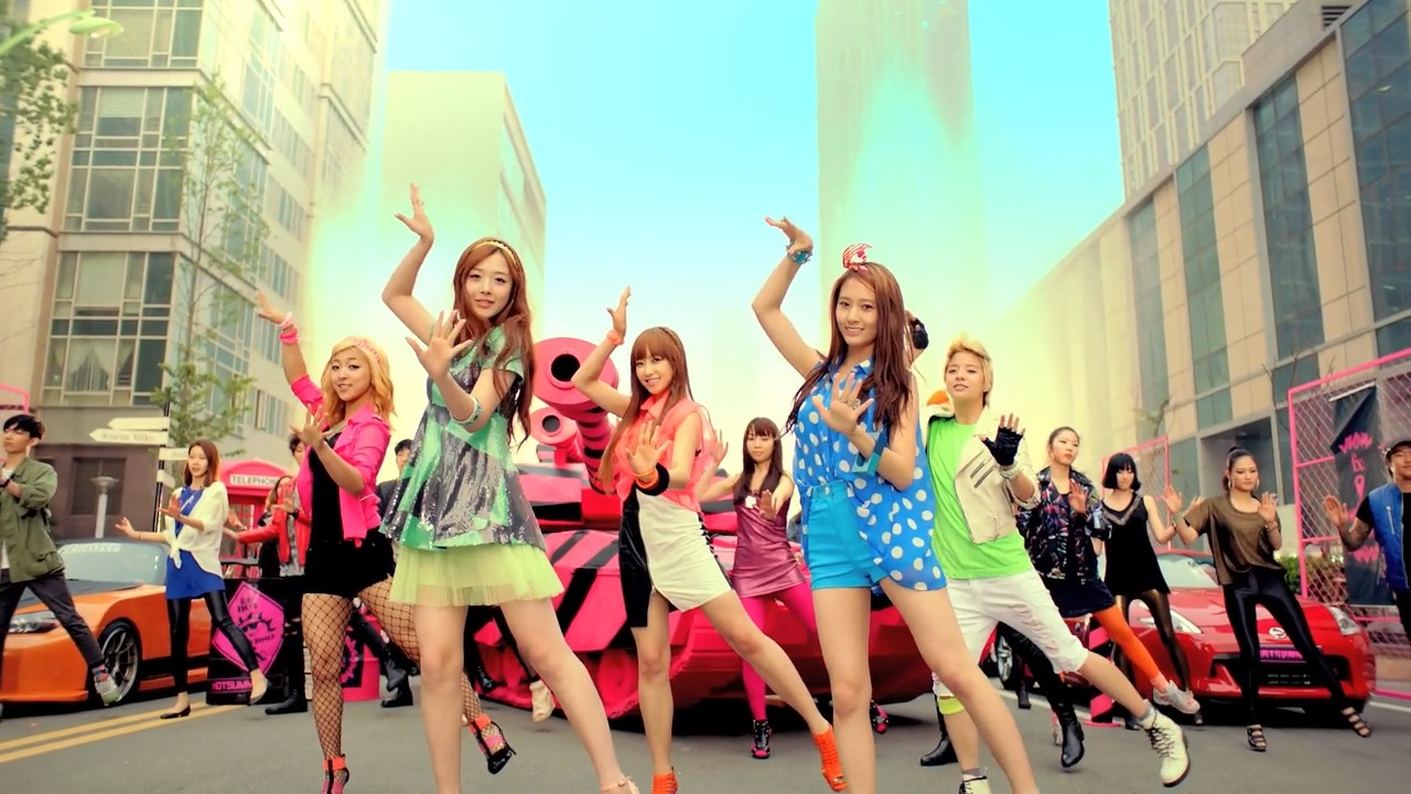 AOAIn 2012, AOA made their debut with “Elvis” where they alternated from performing as a band and as a dance group. Their stage outfits seemed to be a fusion of band uniforms and rhinestone dresses due to their concept.