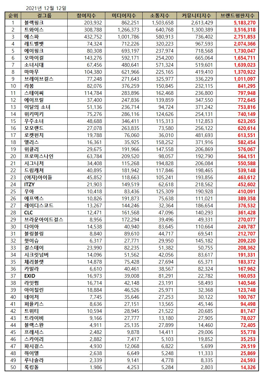 Here are the top 50 girl group brand reputation rankings for December 2021.