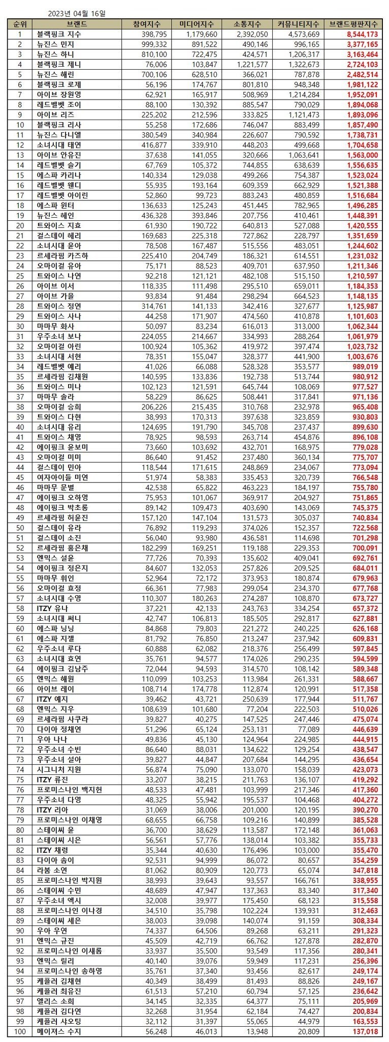 Here are the top 100 girl group member brand reputation rankings for the month of April 2023.