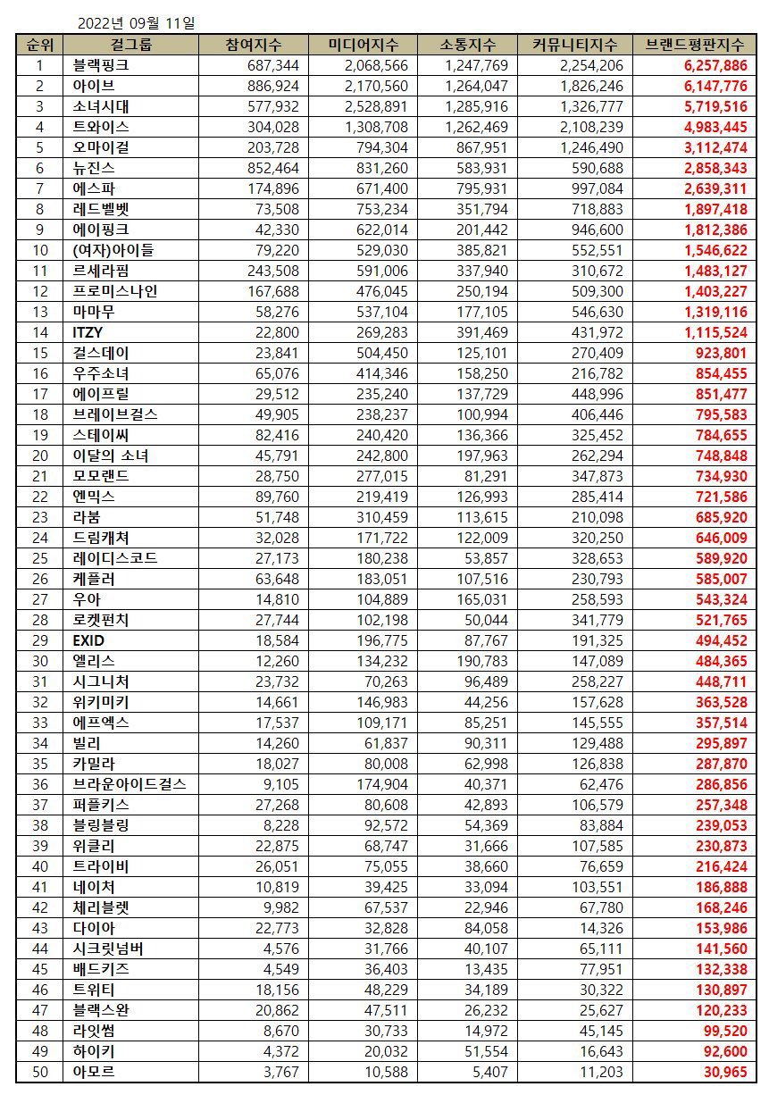 Here are the top 50 girl group brand reputation rankings for September 2022!