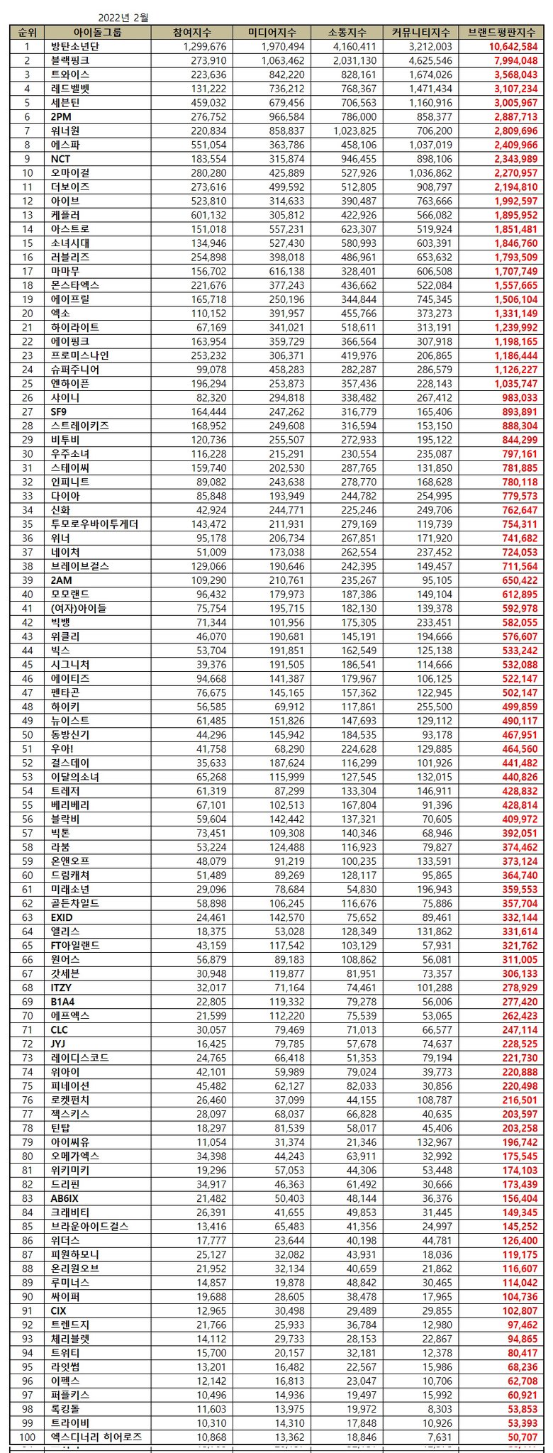 Here are the top 100 K-Pop group brand reputation rankings for February 2022.