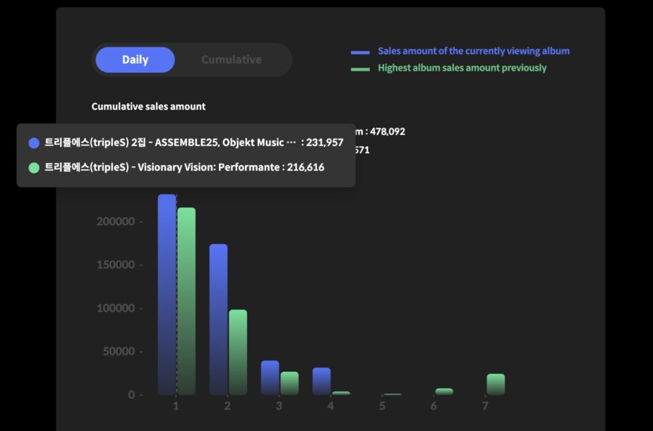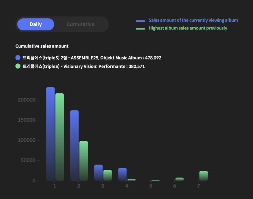 Even more amazingly, with their second day of sales, tripleS already surpassed the total sold during their previous album’s first week. After four days of sales, the total sold is currently sitting at just under an additional hundred thousand more than the last album.