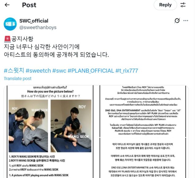 RAPE!? Did you know ข่มขืน means rape? And you use the word rape for those pictures!? At least hire a translator for the statement! That's a very serious accusation(Even Teoy(Roy)and James described #Wangseok actions as sexual harassment). WORST.#SWEETCH #PLANB_OFFICIAL https://t.co/ps9O470bIy
