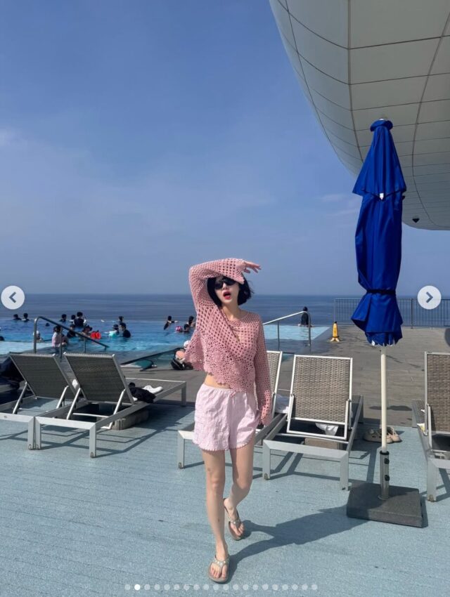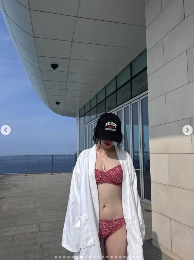 In the photos, she is wearing a red bikini with a pink shirt and shorts by the pool, and the caption reads, “Welcome.”