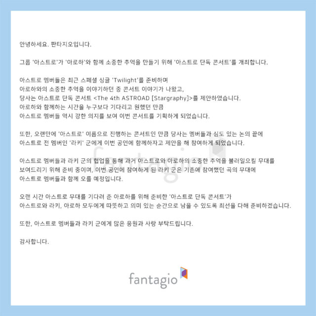 “Hello, this is Fantagio. ASTRO will be holding a concert to create precious memories with AROHAs. While talking about precious memories with fans and preparing for the special single ‘Twilight,’ the topic of a concert came up, and we proposed the concert ‘The 4Th ASTROAD [Stargraphy].’