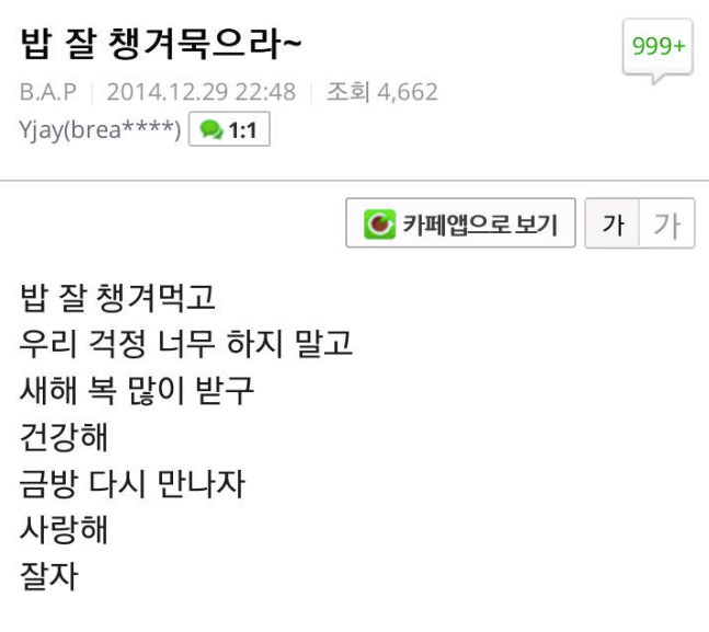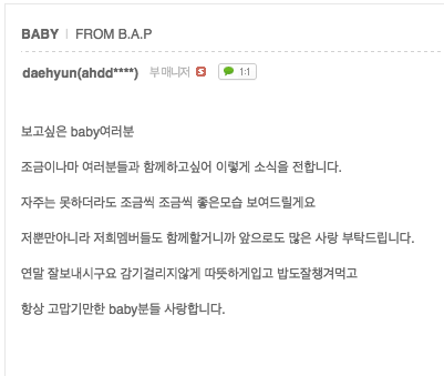 In the first post on the site, Daehyun wrote “To all you Baby, whom I miss. I wanted to be with all of you at least a little so I am sending an update through message to continue to be with you. I will not be able to update often but I will update little by little. The members will be with you as well so please keep loving us. Spend the end of your year well, make sure you don’t catch a cold, dress warmly, and eat well. Dearest babys who I am always thankful for, I love you.”