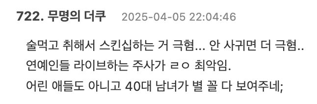 - I really hate it when people get drunk and do skinship… even worse if they’re not dating. The celebrities’ live broadcasts while drunk are seriously the worst. They’re not kids, but people in their 40s showing off all sorts of things.