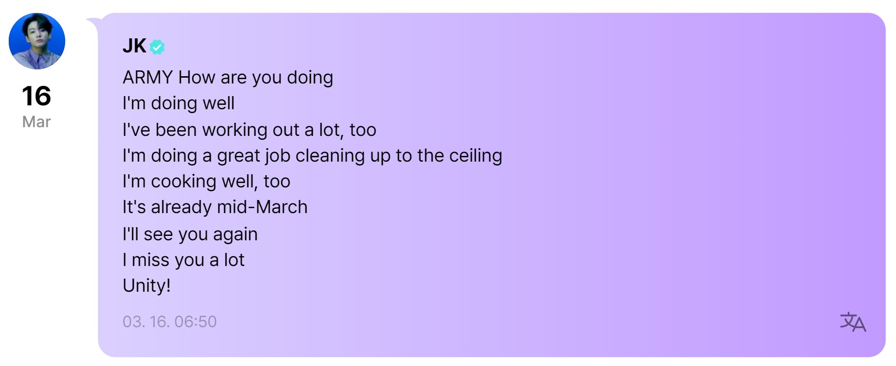 Through a post on Weverse on March 16, Jungkook reassured fans that he was in good health. He said, “ARMY, how are you? I’m doing well,” followed by details of his current routine.