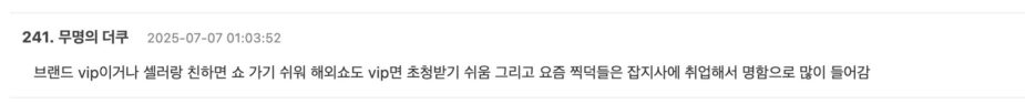 - “If you are a brand VIP or close to sellers, it’s easy to get into overseas shows. If you are a VIP, it’s also easy to get invited. Also, many fan site masters get hired at these magazine companies to get into shows.”