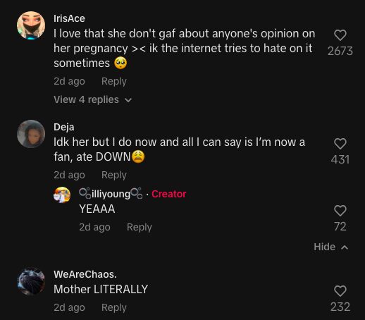It then cuts to her rapping and dancing in sexy office attire that showcases her pregnant belly. This clip went viral on TikTok with 3.4M views at the time of writing.