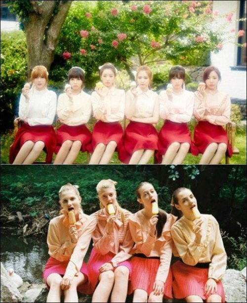 However, since their release, netizens have commented that the images are strikingly similar to the work of fashion photographer, Michael Pudelka. Photos from Michael Pudelka’s work were dug up to compare the similarities, and it was noted that one of the images shows four girls sporting a blank expression and holding ice-creams in their hands, similar to that of Apink’s concept teaser.