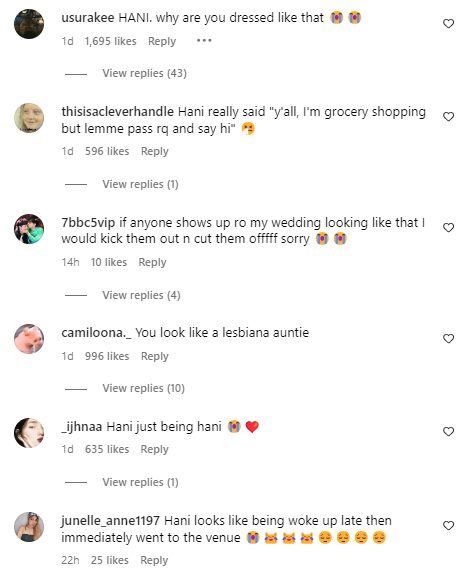 The comments under Hani’s photos were filled with negative reactions to this outfit, as many deemed it too dressed down for a wedding.