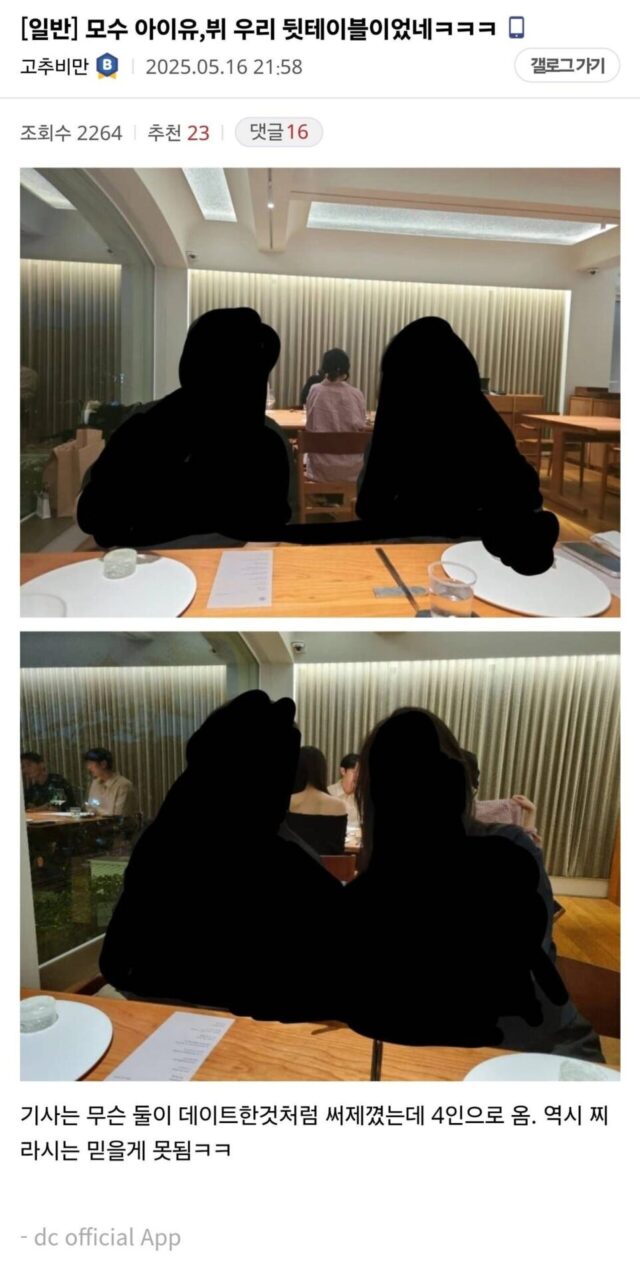 On May 15, KST, pictures of the two idols sitting across from one another at the restaurant went viral. Judging by IU’s clothes, netizens inferred that the two were probably celebrating IU’s birthday.