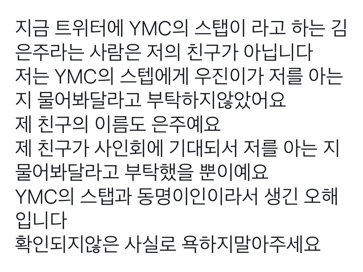 “The person known as the YMC staff member Kim Eun Joo is not my friend. I never asked YMC staff to ask Woojin if he knew me. My friend’s name is also Eun Joo.