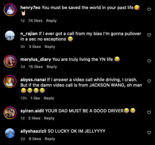 In a follow-up Instagram Story, Aisyah explained how the unexpected video call came about. Jackson had caught a ride via her father’s private hire car-hailing service. Knowing that Aisyah was a fan, her father recognized Jackson, so he asked if it would be okay for Jackson to talk to her via video call. While someone from his team initially said no, Jackson said yes!