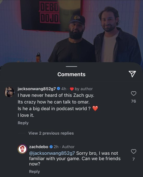 Jackson took it a step further and amped up the hilariousness. Fans found that he had “pettily” commented in a copy-pasta style on one of Zach’s podcasts, exchanging his name for Zach’s.