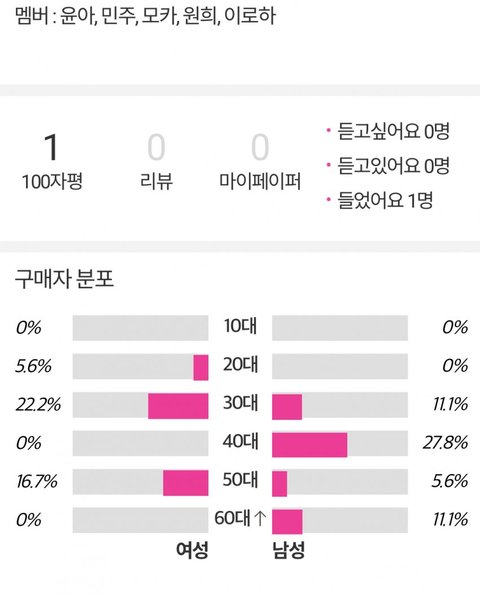 It was revealed that their largest buyer group were men in their 40s, with it covering 27.8% of the buyers. Next was women in their 30s at 22.2%. Women in their 50s came up to 16.7%, while men in their 60s and 30s were 11.1% each. Last but not least, women in their 20s came up to 5.6%. Many fans were shocked that teens seemed to not be purchasing the albums at all via Aladdin.