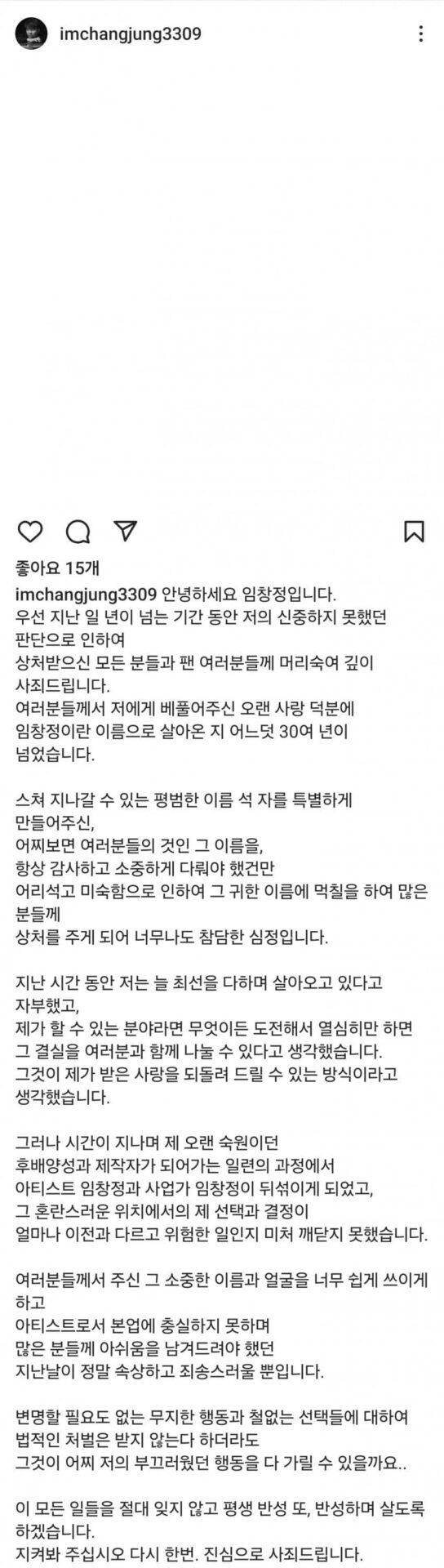 “Hello, this is Im Chang Jung. First, I’d like to apologize to my fans and everyone who was hurt by my reckless judgment over the past year. Thanks to everyone’s love and support, I have been able to live my life as Im Chang Jung for the past 30 years.
