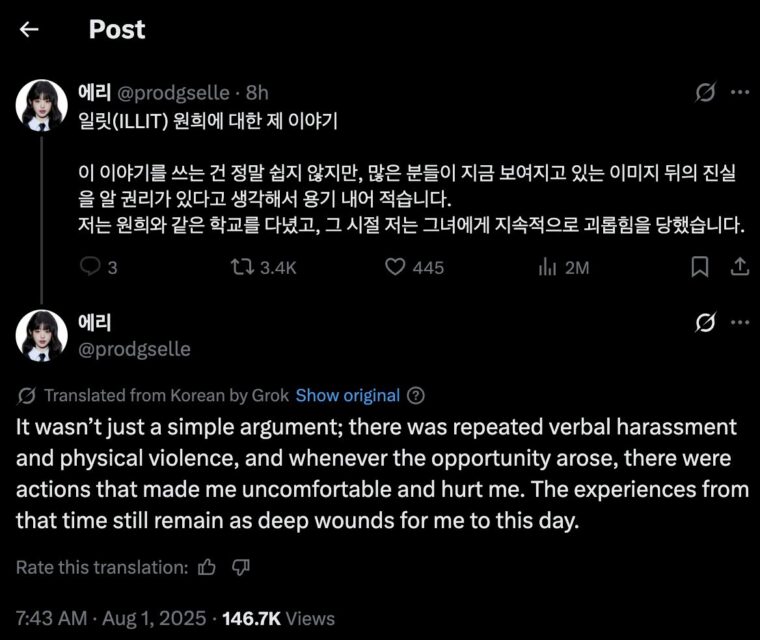 저는 원희와 같은 학교를 다녔고, 그 시절 저는 그녀에게 지속적으로 괴롭힘을 당했습니다.— 에리 (@prodgselle) July 31, 2025