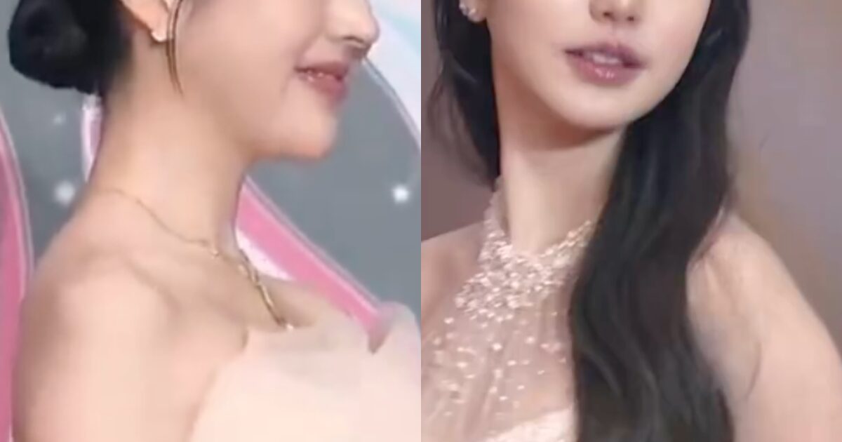 Wonyoung’s gown was beaded and sparkly, suiting her idol image. Her hair was in long waves.