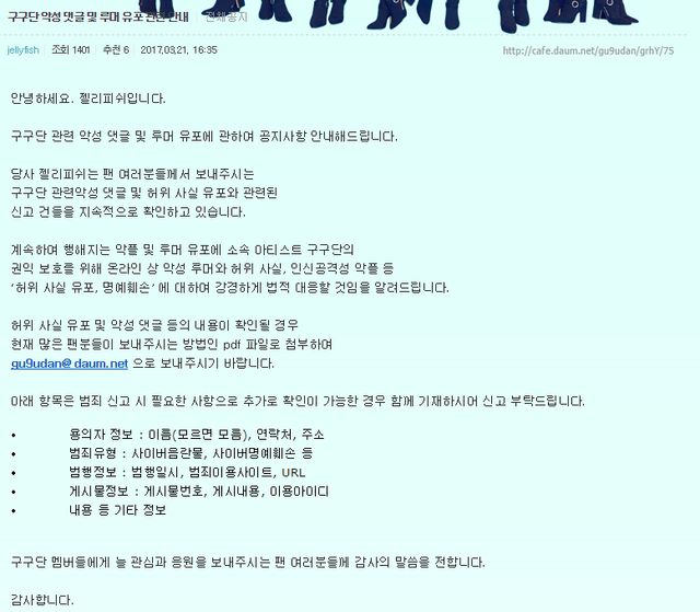 As part of an effort to protect their artists from malicious rumors and false facts, Jellyfish Entertainment asks Gugudan fans to report any such incidents for further investigation.