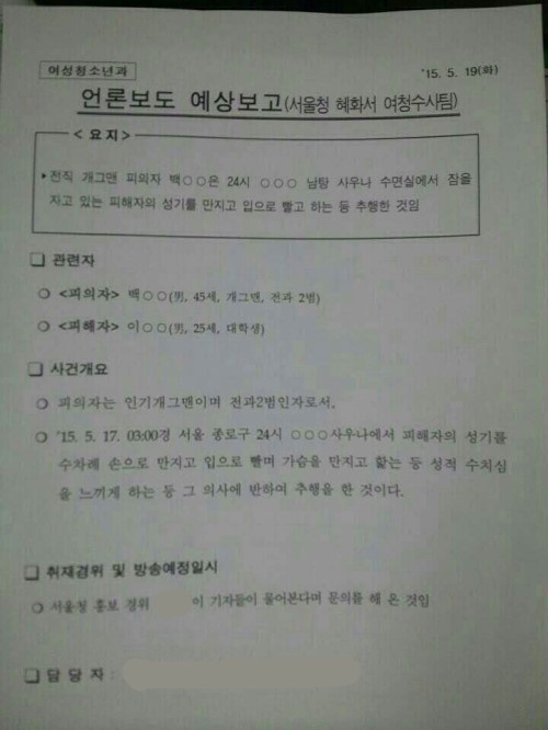 In the police statement it states, “15.5.17 approximately 03:00 o’clock at a OOO 24 hours sauna located in Seoul Jongro, the culprit touched the victim’s genitals multiple times with his hand and sucked it with his mouth. He also touched and licked his chests and shamed him sexually without consent.”