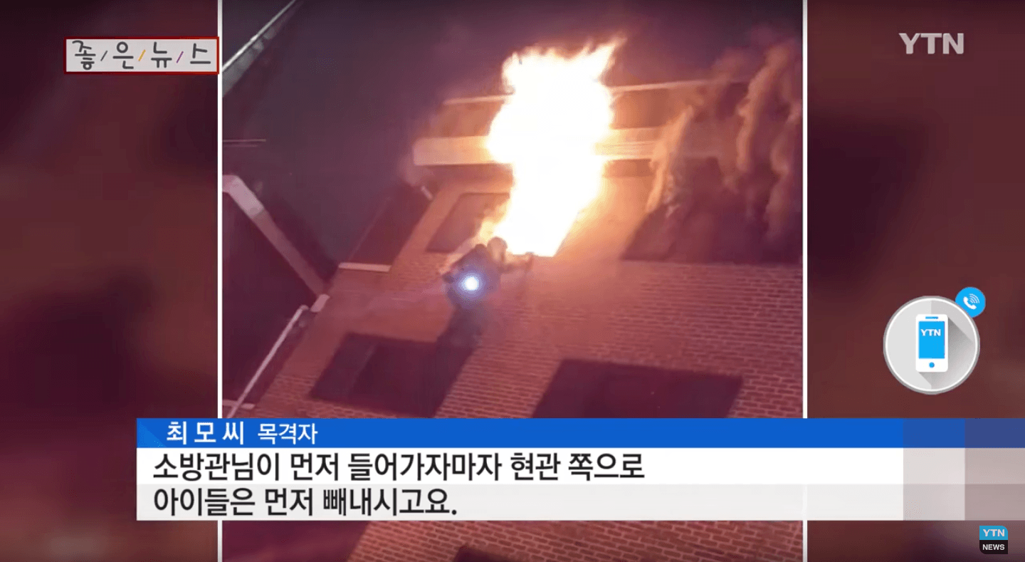 According to YTN, 5 residents of the building were still stuck inside, including two children on the third and fourth floors, as well as a child’s parent in the building next to it. Firefighters quickly ran in and helped them jump out of the building window down to a safety net outside.