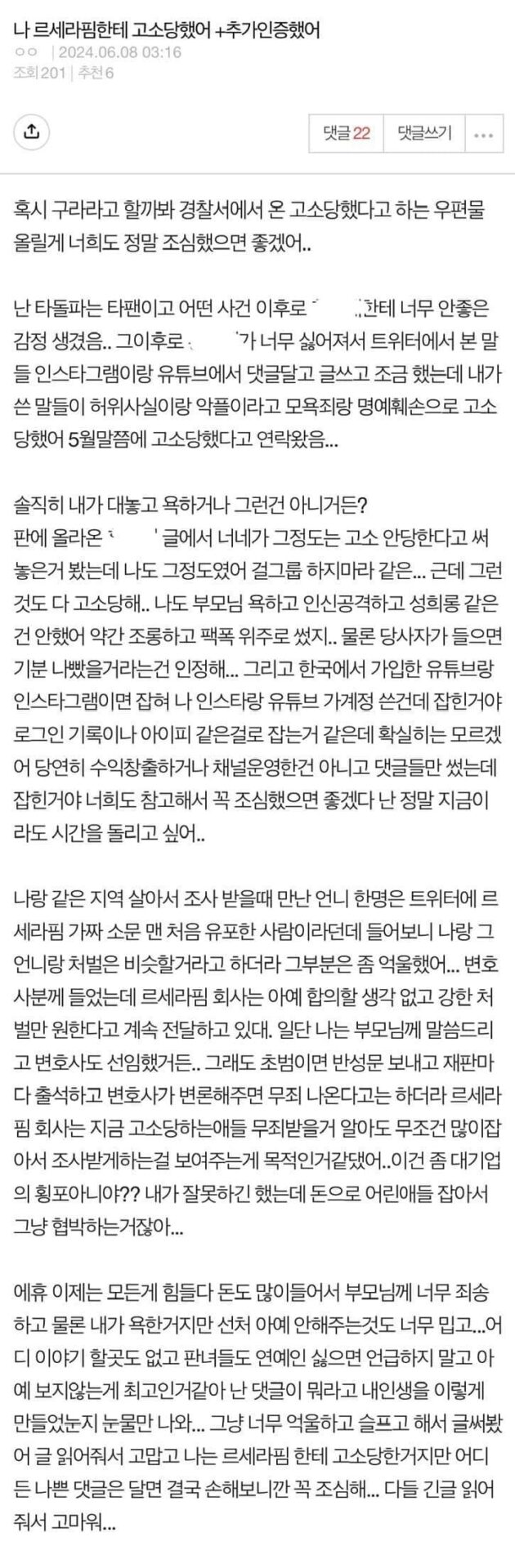 I’m actually a fan of another group, but after a certain incident, I started having really negative feelings towards LE SSERAFIM. Since then, I began to dislike them so much that I posted some comments on Instagram and YouTube based on things I saw on Twitter. However, those comments were considered defamatory and insulting, so I got sued for spreading false information and defamation. I got notified around the end of May.