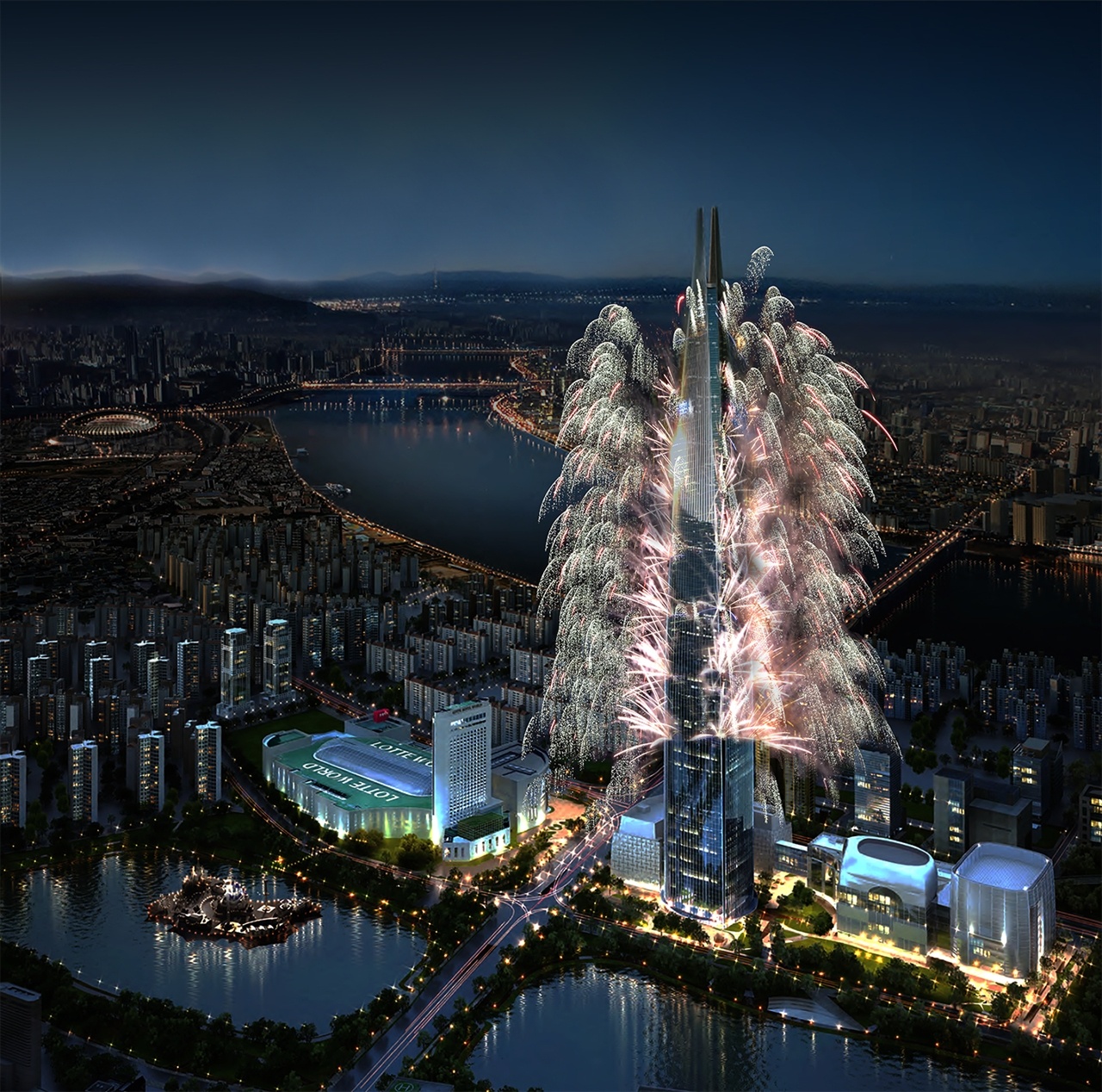On April 2, Korea celebrated the opening of its new tallest building, the Lotte World Tower, with 123 floors and standing 555m tall, near Seokchon Lake in Songpa, Seoul.