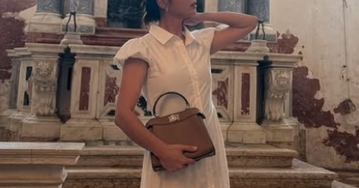 She is seen posing with her bag in front of an altar with a crucified statue of Jesus.