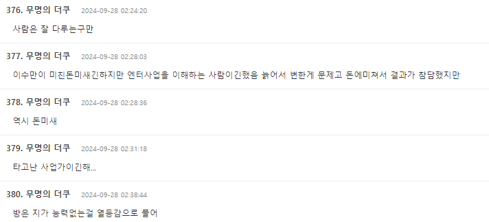 - “Lee Soo Man may be crazy about money, but he was someone who understood the entertainment business. The problem is that he changed as he got older, and the results were dismal because he was crazy about money.”