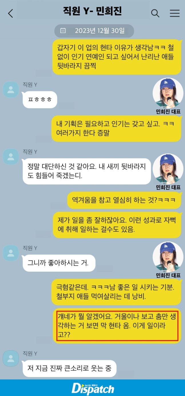 Dispatch released a series of shocking text messages by Min Hee Jin and other ADOR staff.