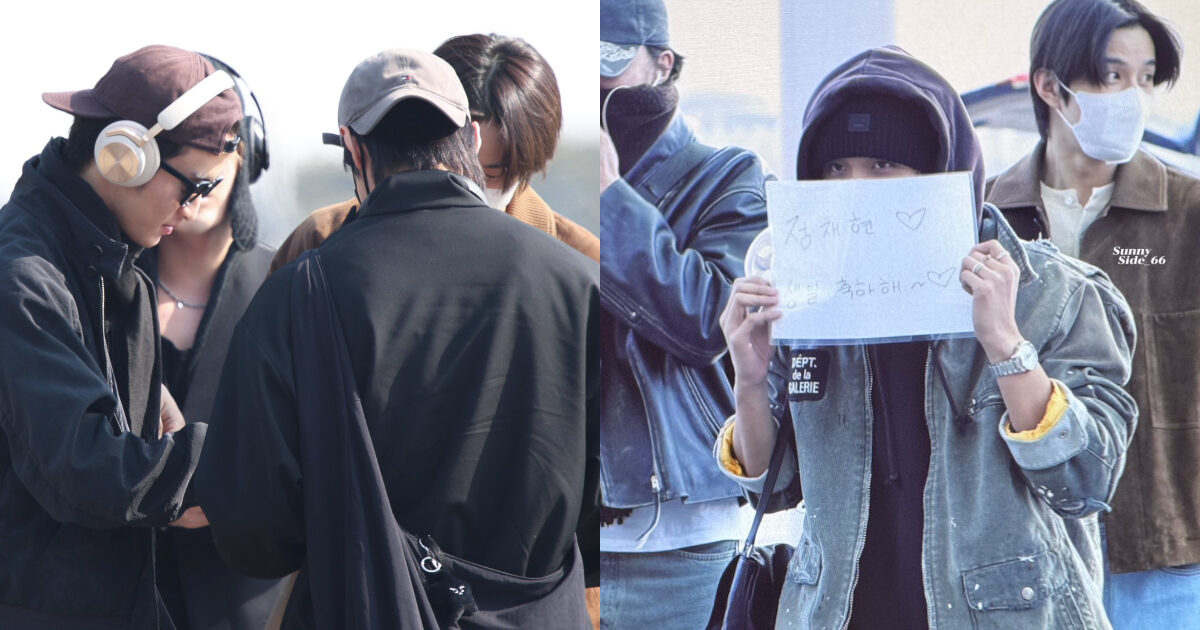 However, when the members arrived at the airport, fans noticed they had prepared something. After getting out of the van, Doyoung could be seen handing something out to the other members.