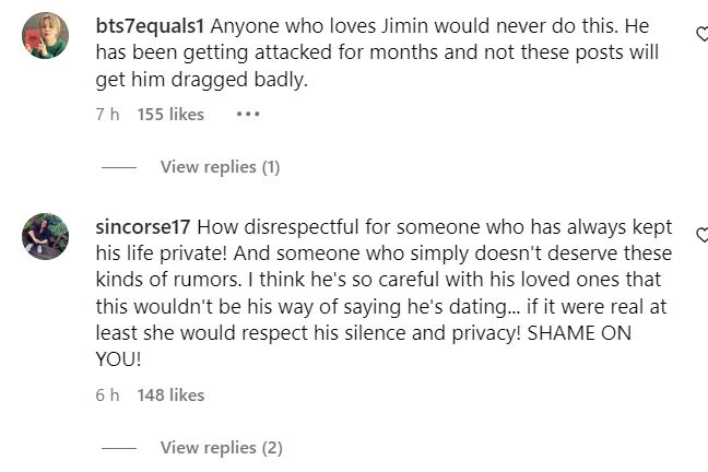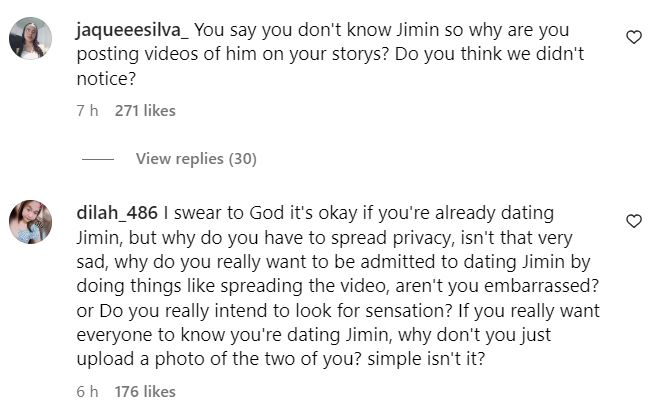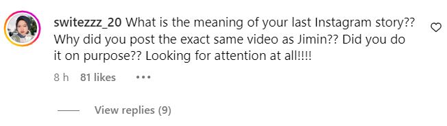 When the Instagram stories were shared online, netizens shared their anger at Song Da Eun for using Jimin as “clout” and seemingly trying to “hint” that they were dating with posts that linked to the BTS idol. Others shared that they had no issues with Jimin dating, but they didn’t like her seemingly “attention seeking” with her posts.