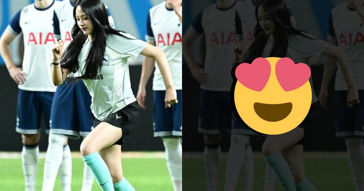 But a picture capturing Minji’s kick went viral for completely different reasons, as netizens spotted Brennan Johnson from Tottenham Hotspur cheesing behind the idol while she kicked the ball.