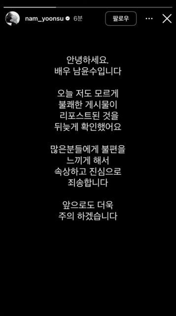 Actor Nam Yoon Su has found himself at the center of controversy after an unexpected repost on his Instagram account caused a stir online.