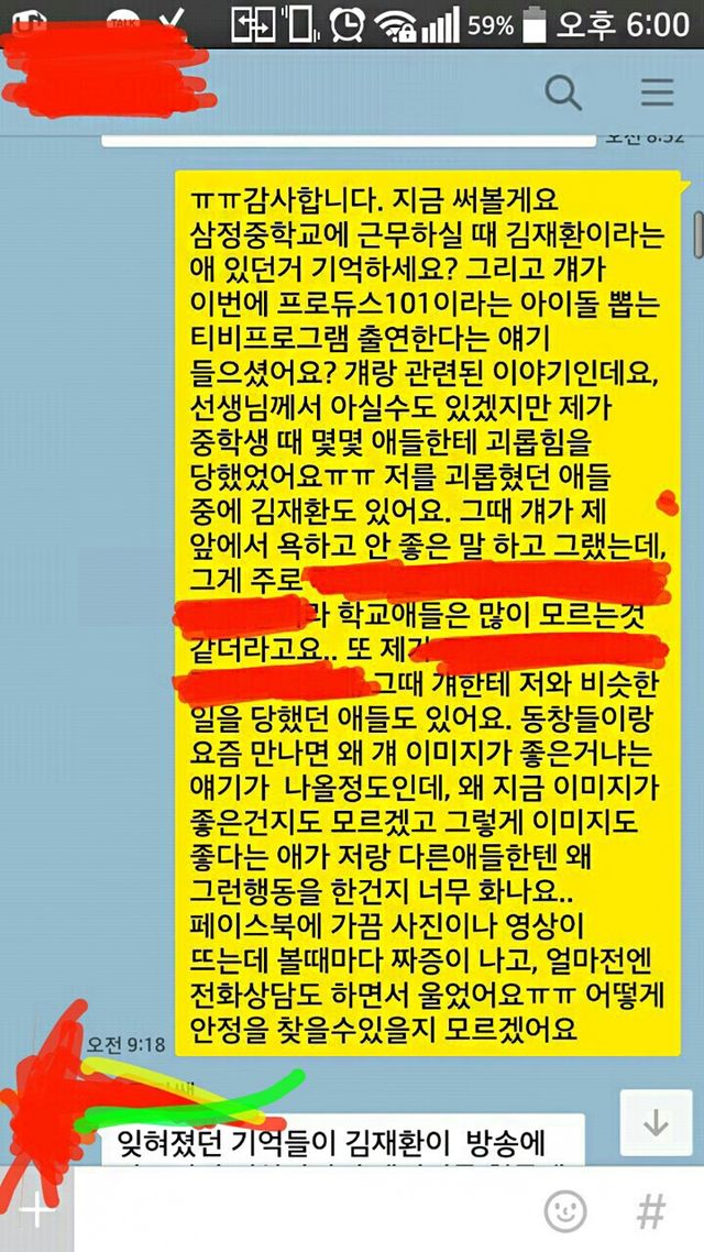 “Do you remember a student named Kim Jae Hwan? And did you hear that he’s appearing on the debut survival show called Produce 101? It’s a story related to him. As you well know, I was harassed by couple of students back in middle school ㅠㅠ Kim Jae Hwan was one of the kids who bullied me. He used to curse at me and say hurtful things… I think not many students knew about it… There were also other students who were victims like me. When I meet up with my childhood friends, we always wonder how he got to have such image. I don’t understand how he got to have such a great image, and why someone with such a great image now would have bullied me back then. I’m so angry…”