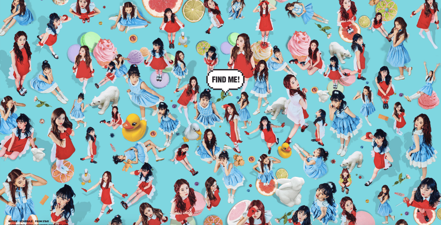 The teaser photos were published on Instagram and their official website. The first batch of teaser images released was of Seulgi and can be found through a mini-game on their official website in which you have to find the member.