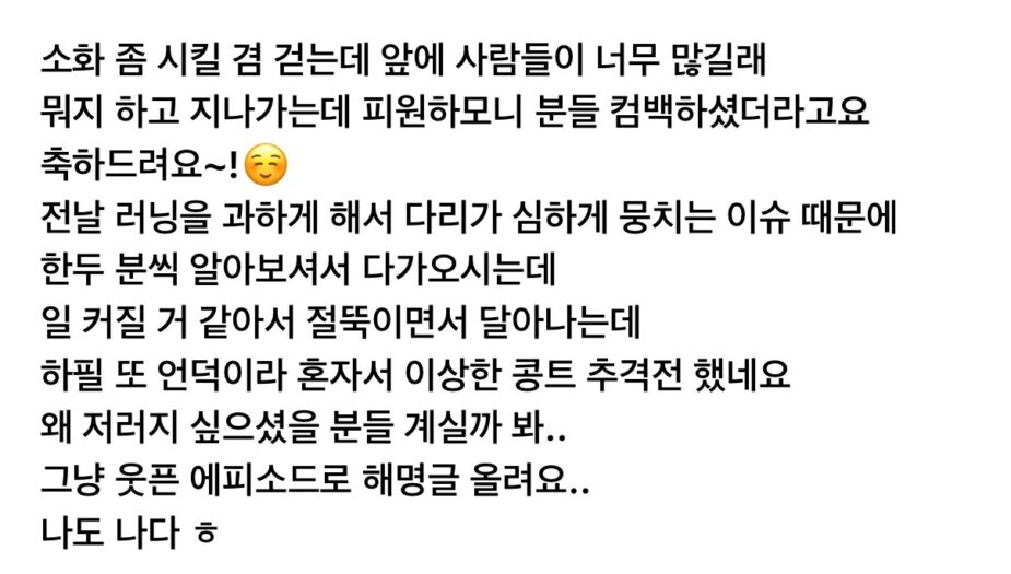 I was walking to digest the food I had eaten, but so many people were in front of me. It turns out P1Harmony has made a comeback! Congrats! I ran the day before, so my legs were cramped, and with more people recognizing me, I felt that I should walk away before things got out of hand. But because I was limping and the road was uphill, I might have looked strange trying to run away. I am posting this to explain the situation in case people wonder why I walked away like that. Why am I like this?