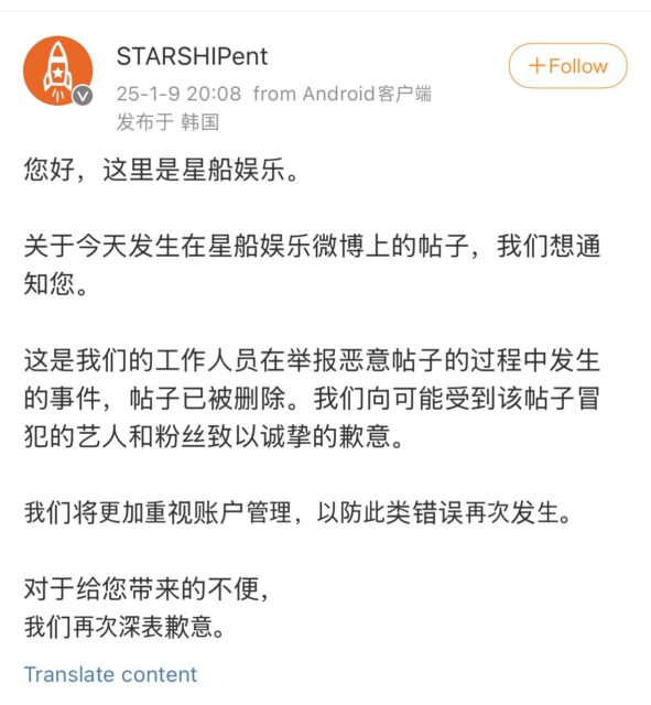We would like to update on the incident that happened on Starship Entertainment’s Weibo today. The incident happened when our staff was reporting malicious posts, and the post has since been deleted.