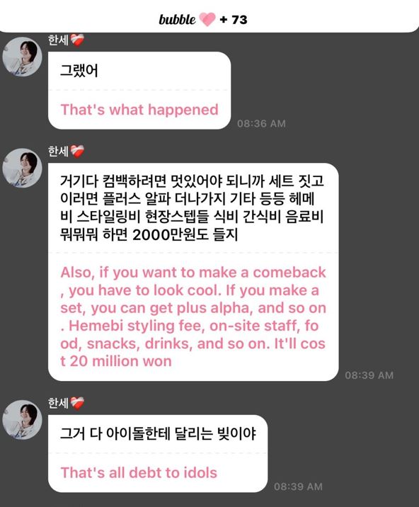 Hanse then explained about the extra costs outside of actually participating and how they’re all “debt” to idols, including building a set, which costs extra on top of that, along with hair, makeup, styling fees, on-site staff meals, snacks, and drinks, among other expenses. He added that it could all add up to ₩20.0 million KRW (about $14,700 USD)