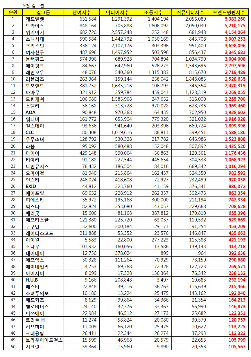 The Korea Reputation Center analyzed big data from August 7 to September 8 to calculate the brand reputation of the most popular girl groups of September.